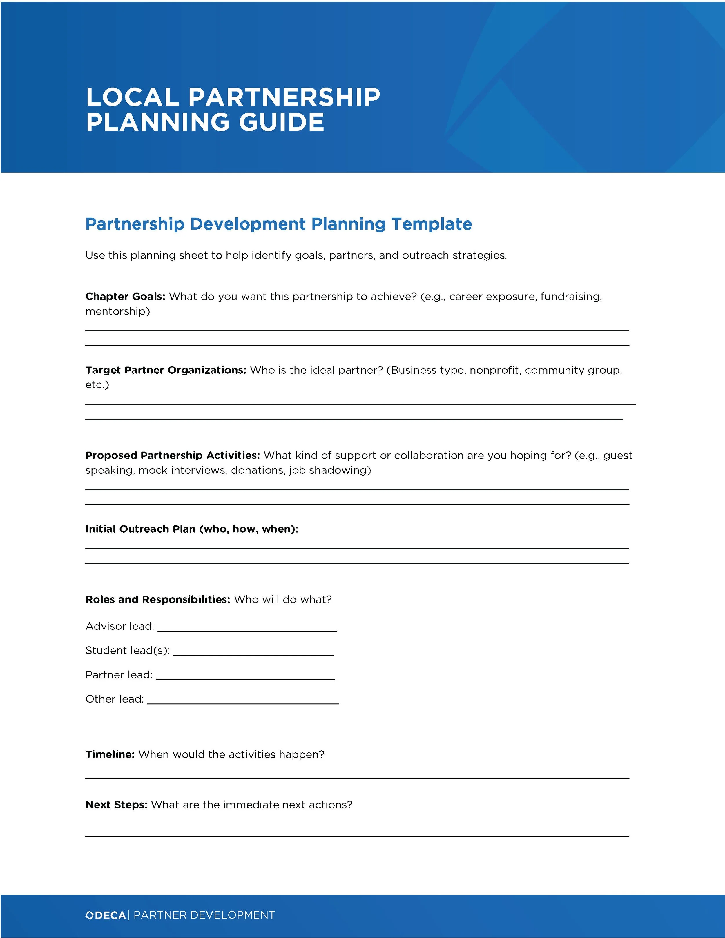 Local business partnerships open the door for DECA chapters to connect classroom learning with the real world. Whether it’s gaining mentors, finding internships, inviting guest speakers, or collaborating on projects, these partnerships give members hands-on experiences that build career skills. Businesses can also provide sponsorships, resources, and networking opportunities, helping chapters grow while supporting students in becoming strong emerging leaders. Click on the resources below to help you get started!